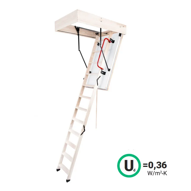 Четырехсекционная складная лестница из ели. Высота лестницы от потолка до пола: 2870 мм, с помощью дополнительной секции можно увеличить высоту до 3300 мм