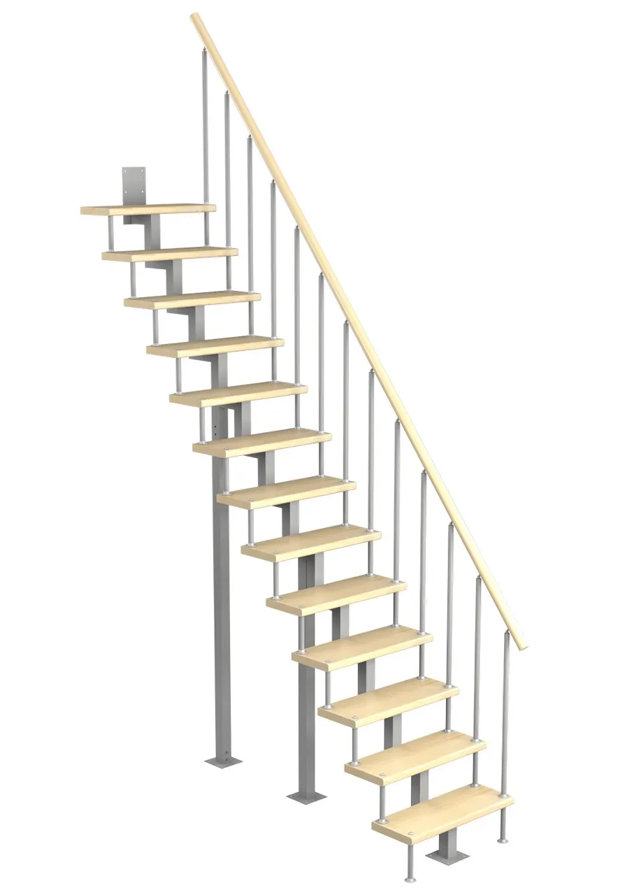 Универсальная лестница, имеющая в основе своей конструкции наклонную опорную балку. Легко впишется в любой интерьер, даже на неровном полу. Место под площадкой можно закрыть и использовать для хранения различных предметов. Монтаж осуществляется силами двух человек на объекте по указаниям, приведенным в паспорте на лестницу.