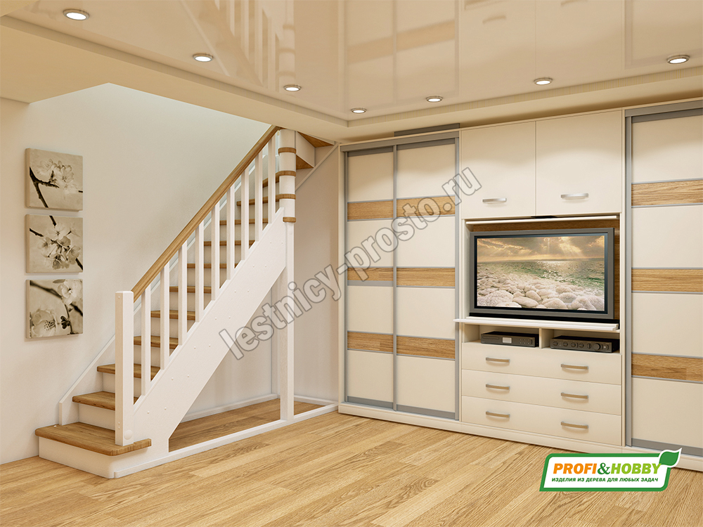 Ступени и поручень лестницы изготовлены из дуба, остальные элементы из сосны.