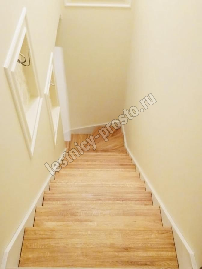 Ступени лестницы изготовлены из лиственницы категории А/В паркетной склейки без какого-либо покрытия. Вы можете заказать у нас предварительную профессиональную покраску деревянных элементов материалами БИОФА в широкий спектр цветов (стоимость зависит от количества ступеней).