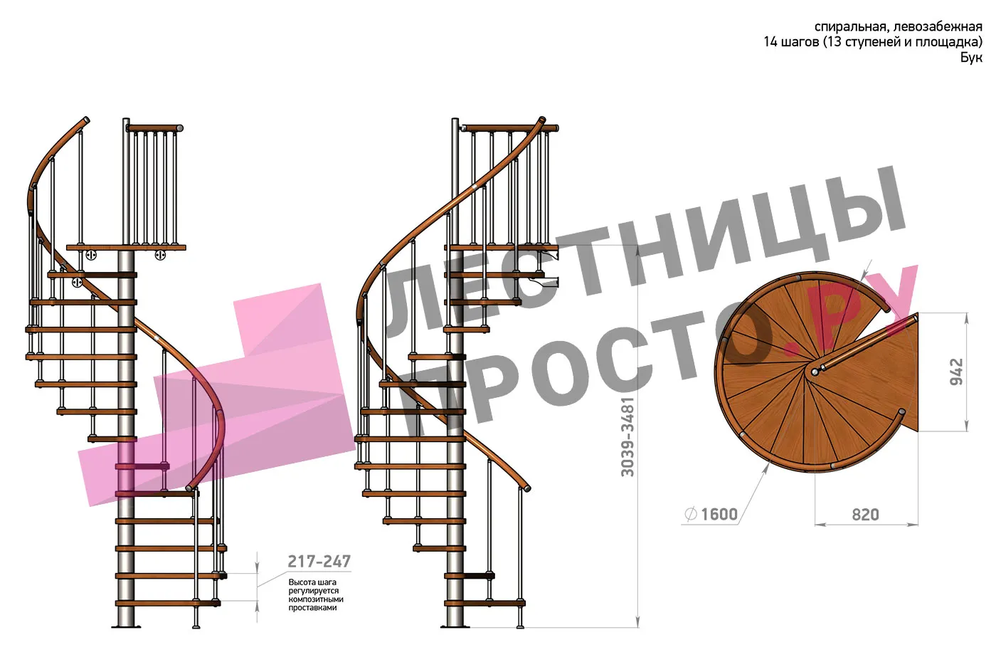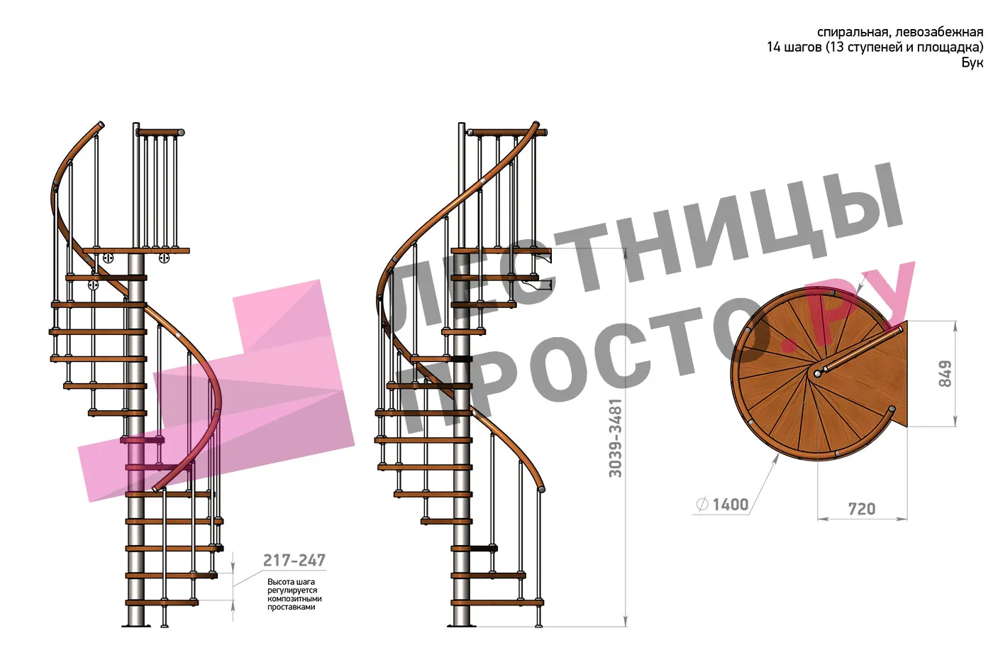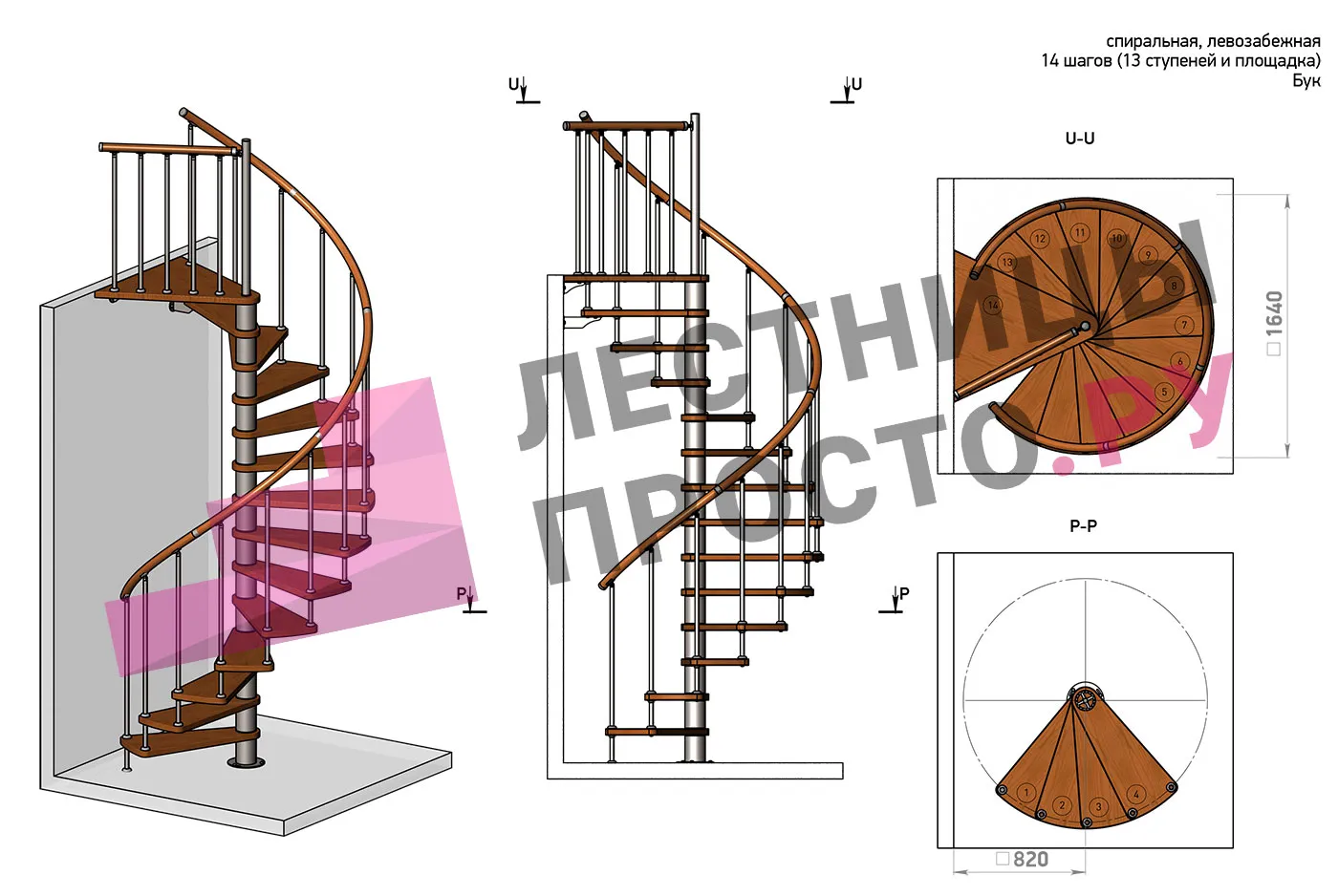 Левая, d=140см, 14 ступеней + площадка