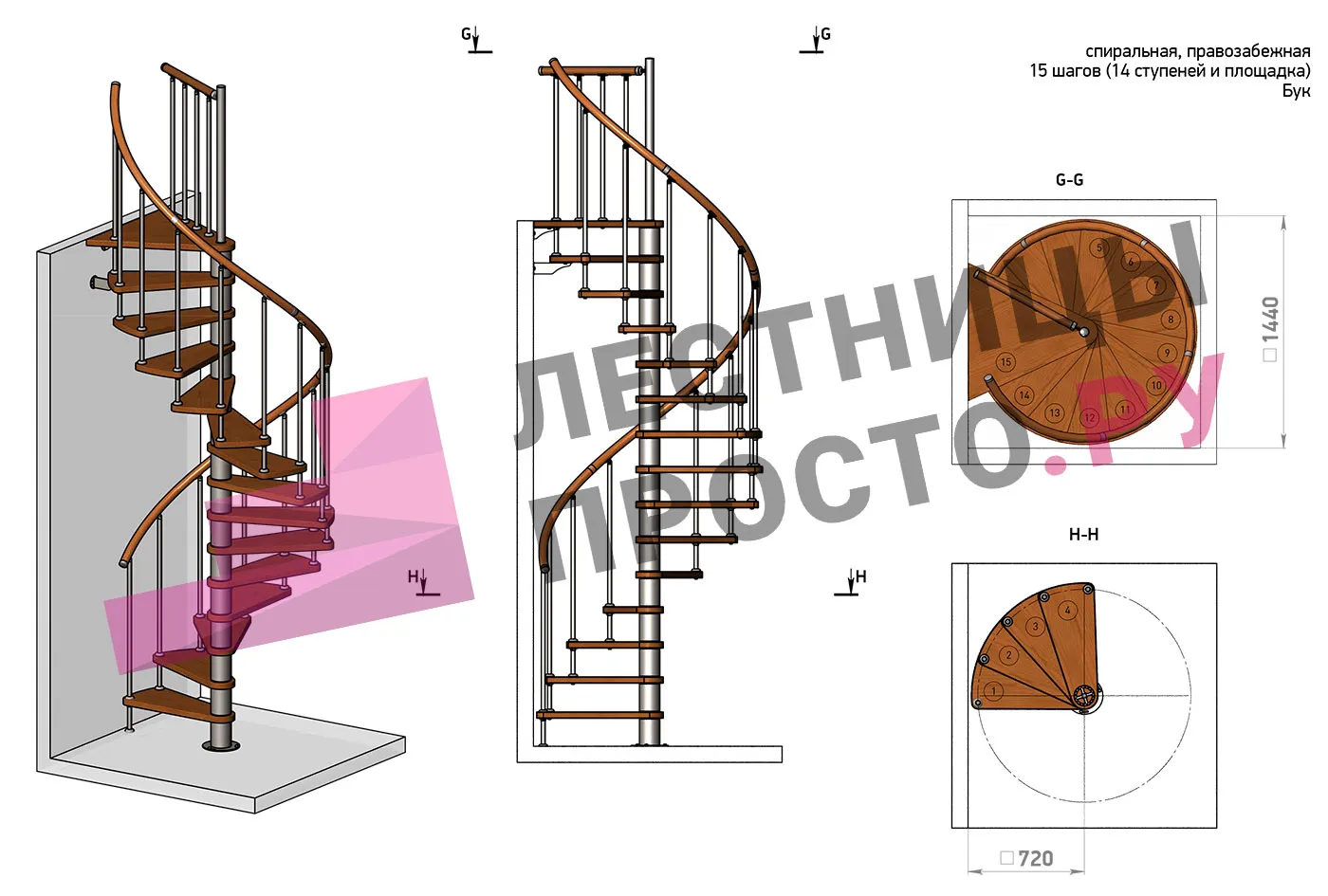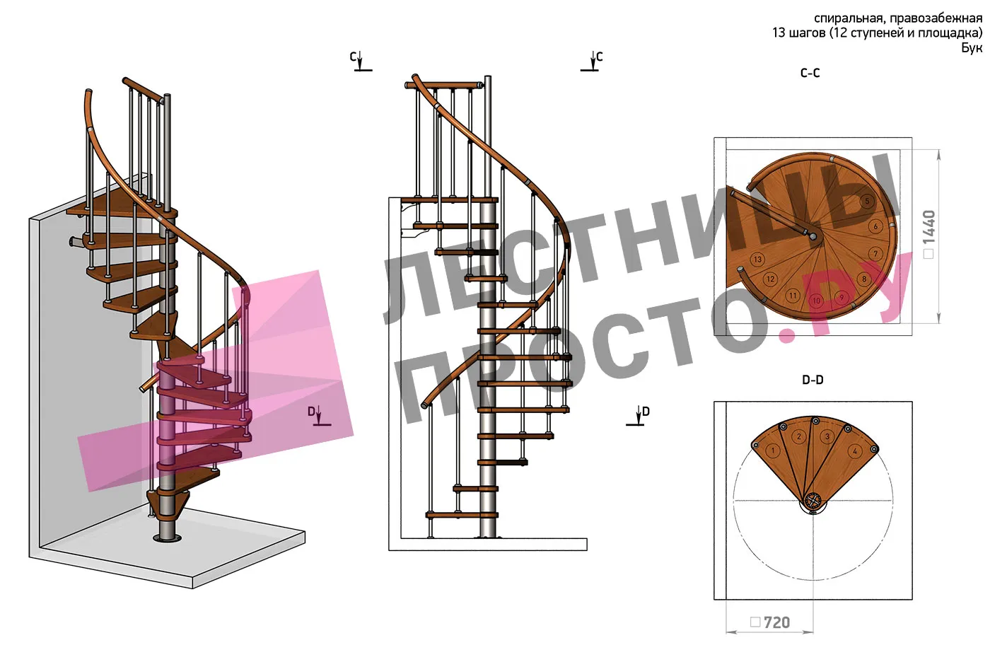Правая, d=120см, 14 ступеней + площадка