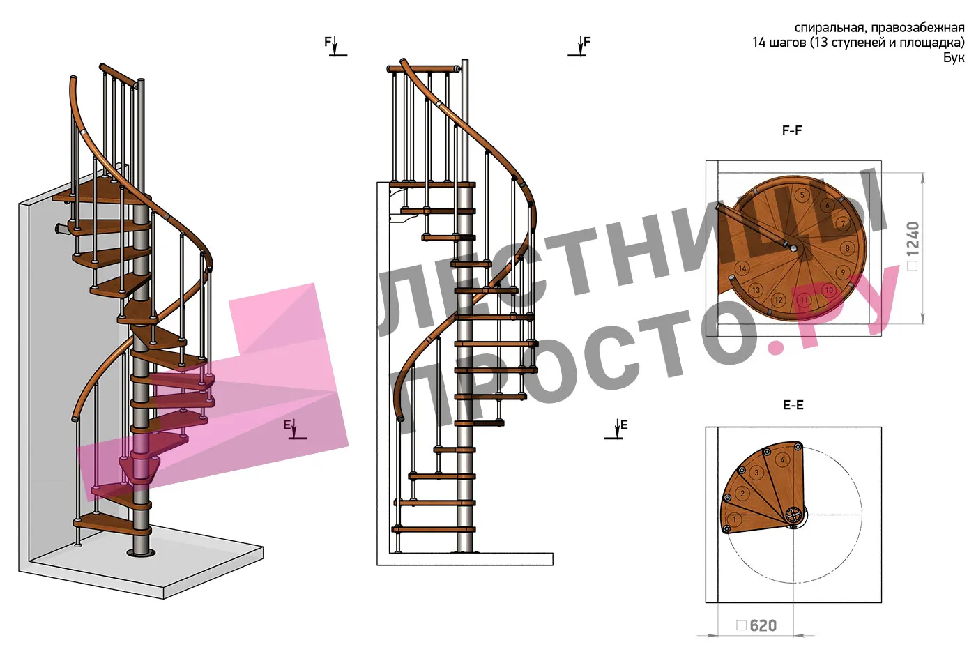 Ширина ступени между стойками и центральной колонной ≈ 48 см