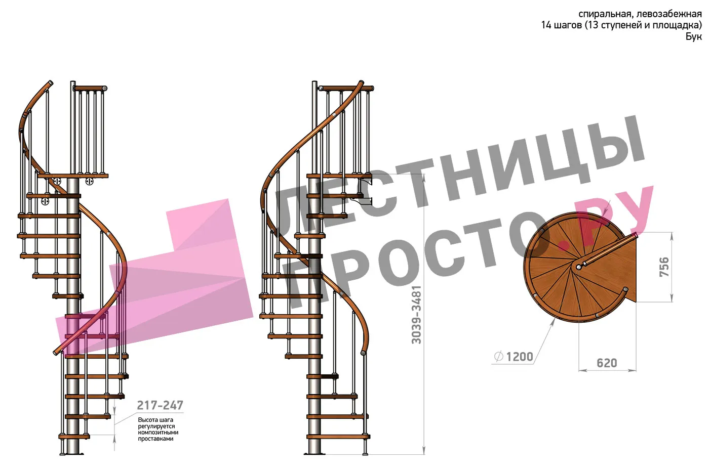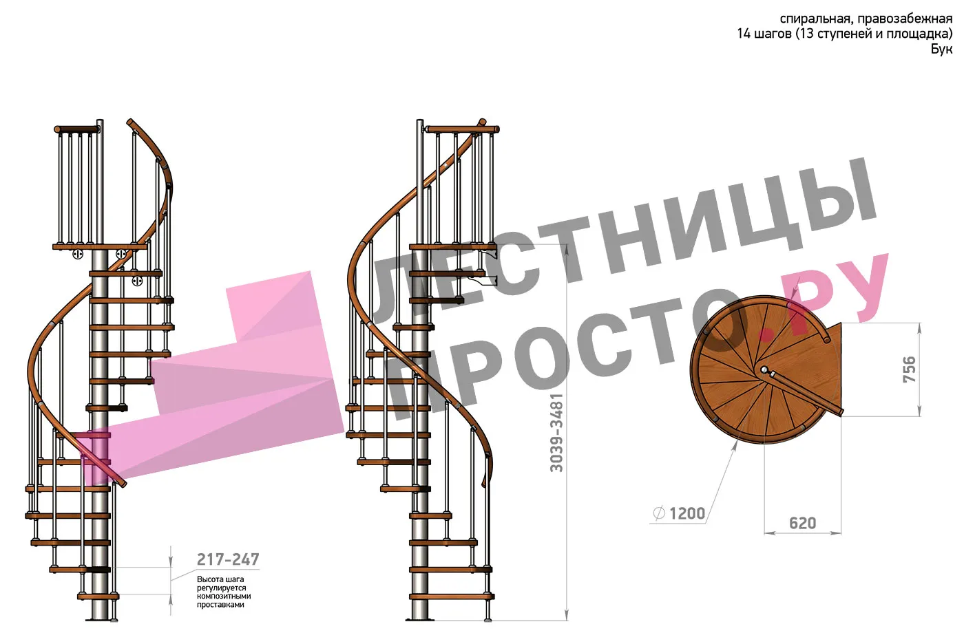 Высота ступеней регулируется с шагом 3 мм. в пределах 217-247 мм., благодаря чему, лестница прекрасно подгоняется под необходимую высоту.