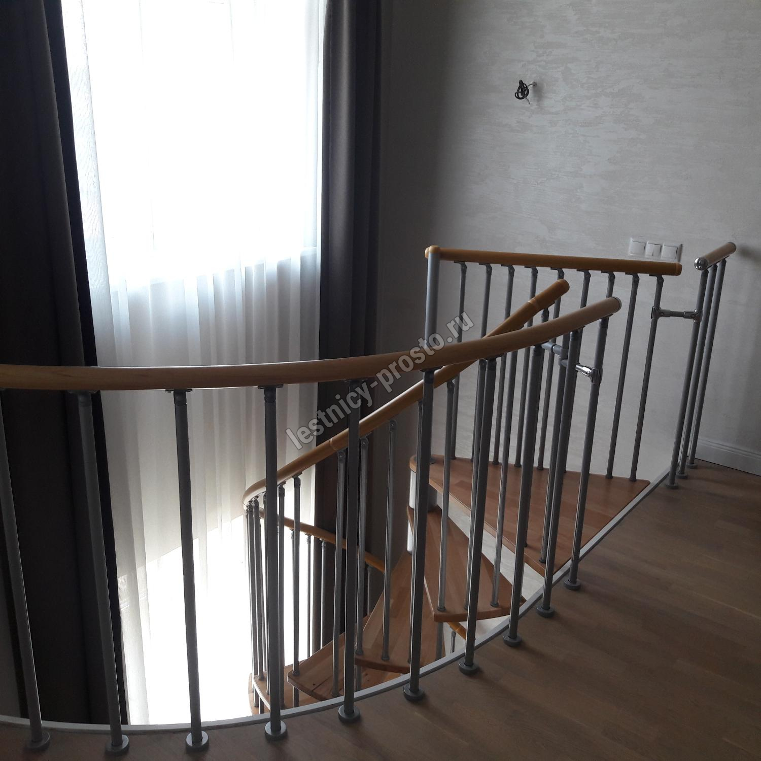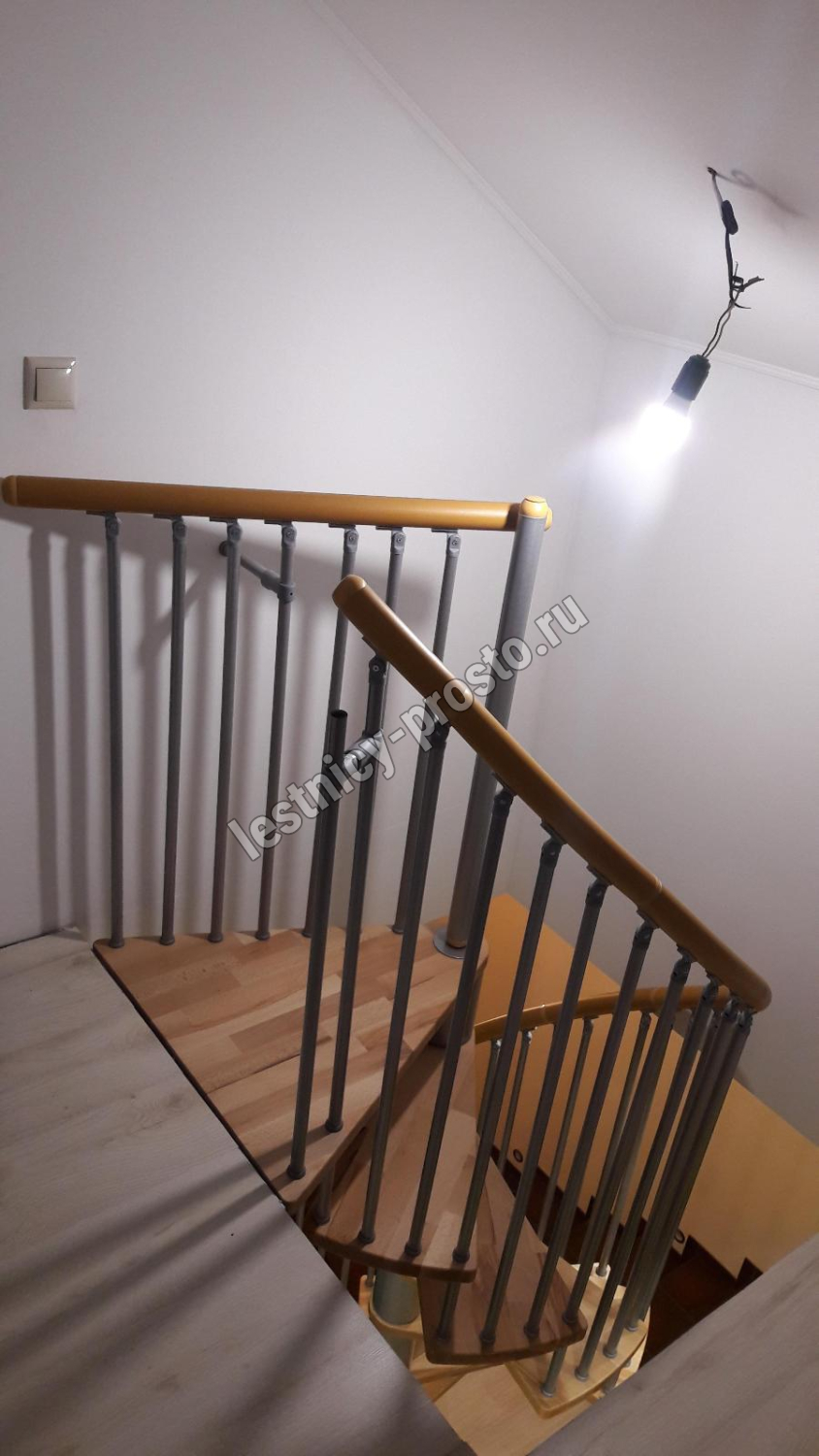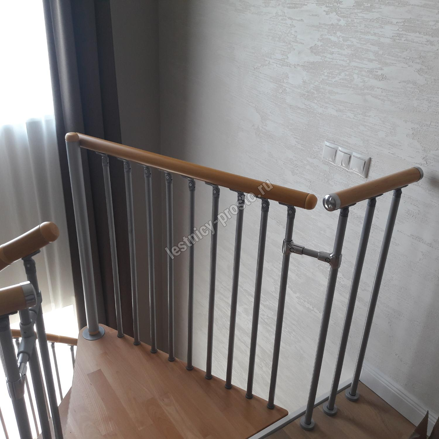 Поручень лестницы изготовлен из массива дуба в тон ступеням. Ступени и поручень покрыты износостойким защитным лаком.